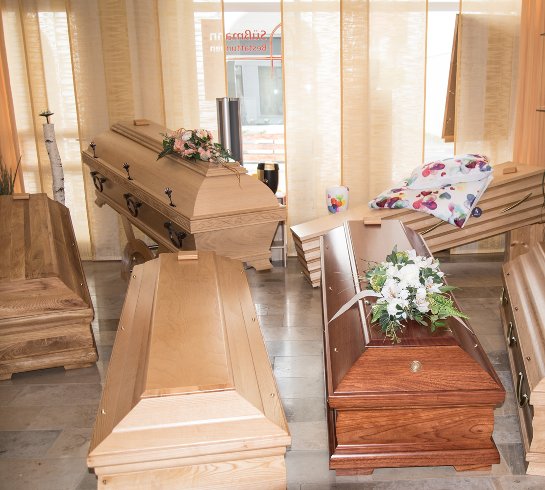 Die Auswahl an Särgen und Urnen folgt in ihrer Vielfalt der Individualität des Menschen. Neben traditionellen und in der Gestaltung schlicht gehaltenen Särgen kann die Beisetzung auch in exklusiv angefertigten Produkten aus aufwendig bearbeiteten Hölzern erfolgen. Gleiches gilt für die zur Beisetzung der Asche des Verstorbenen notwendigen Urnen. Neben Standard-Urnen bieten wir auch Schmuckurnen mit unterschiedlichsten Bemalungen und Verzierungen an. Als Materialien dienen Metall und Holz ebenso wie Naturstein oder Keramik. Für See- oder Naturbestattungen halten wir Gefäße aus wasserlöslichen bzw. biologisch abbaubaren Rohstoffen bereit. Unser Sortiment umfasst darüber hinaus sogenannte Mini-Urnen in vielfältigen Varianten. Mini-Urnen enthalten eine kleine Menge der Asche des Verstorbenen und dürfen den Angehörigen als Erinnerungsstück ausgehändigt werden, während der überwiegende Teil der Asche entsprechend den in Deutschland geltenden Regeln beigesetzt werden muss.